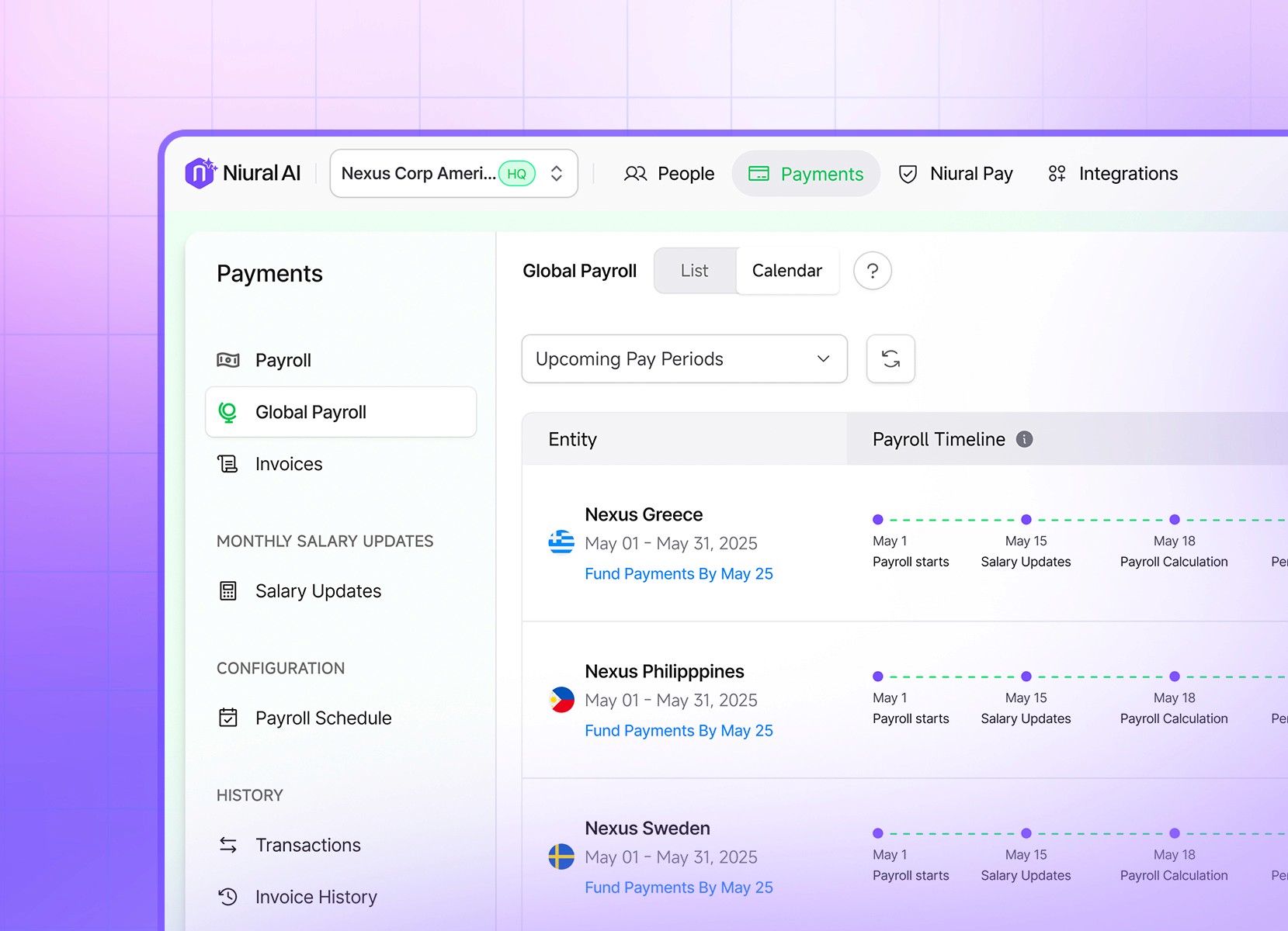 Niural manages payroll calculation, local compliance, and multi-currency payments across every country you operate in.